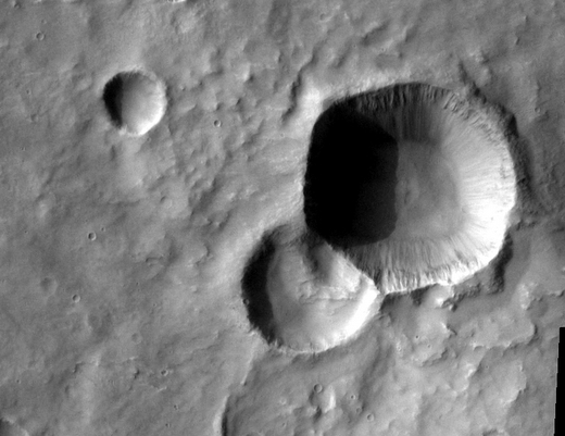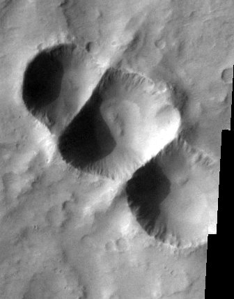 در این تصویر سه دهانه برخوردی درست در یک زمان بوجود آمده اند که حاصل برخورد هم زمان تکه های مختلف یک شهاب سنگ به سطح مریخ است . نیرو های بوجود آمده در اثر برخورد باعث شده تا یک دیوار خطی میان هر کدام از این دهانه ها قرار بگیرد و این سه دهانه را به این شکل از هم جدا کند(مشاهده تصویر بزرگتر) .