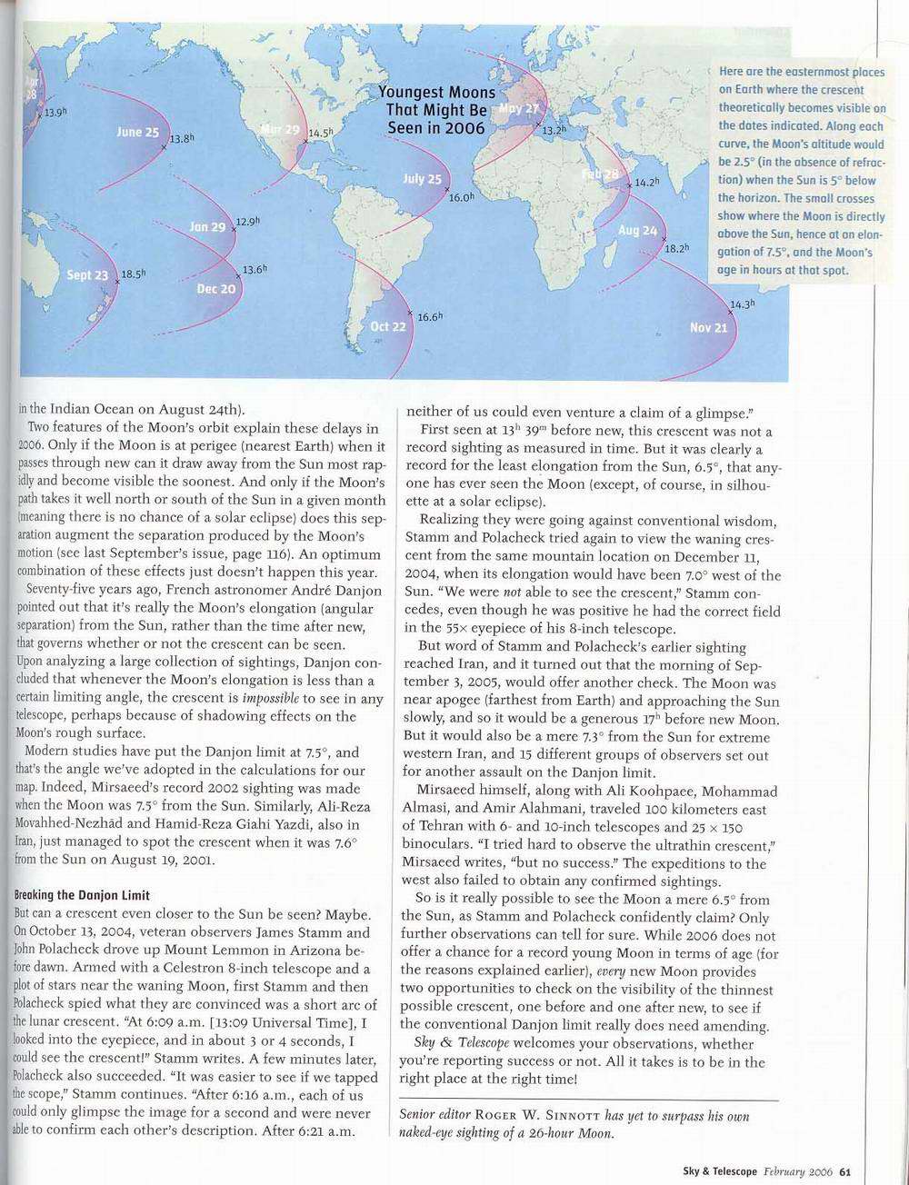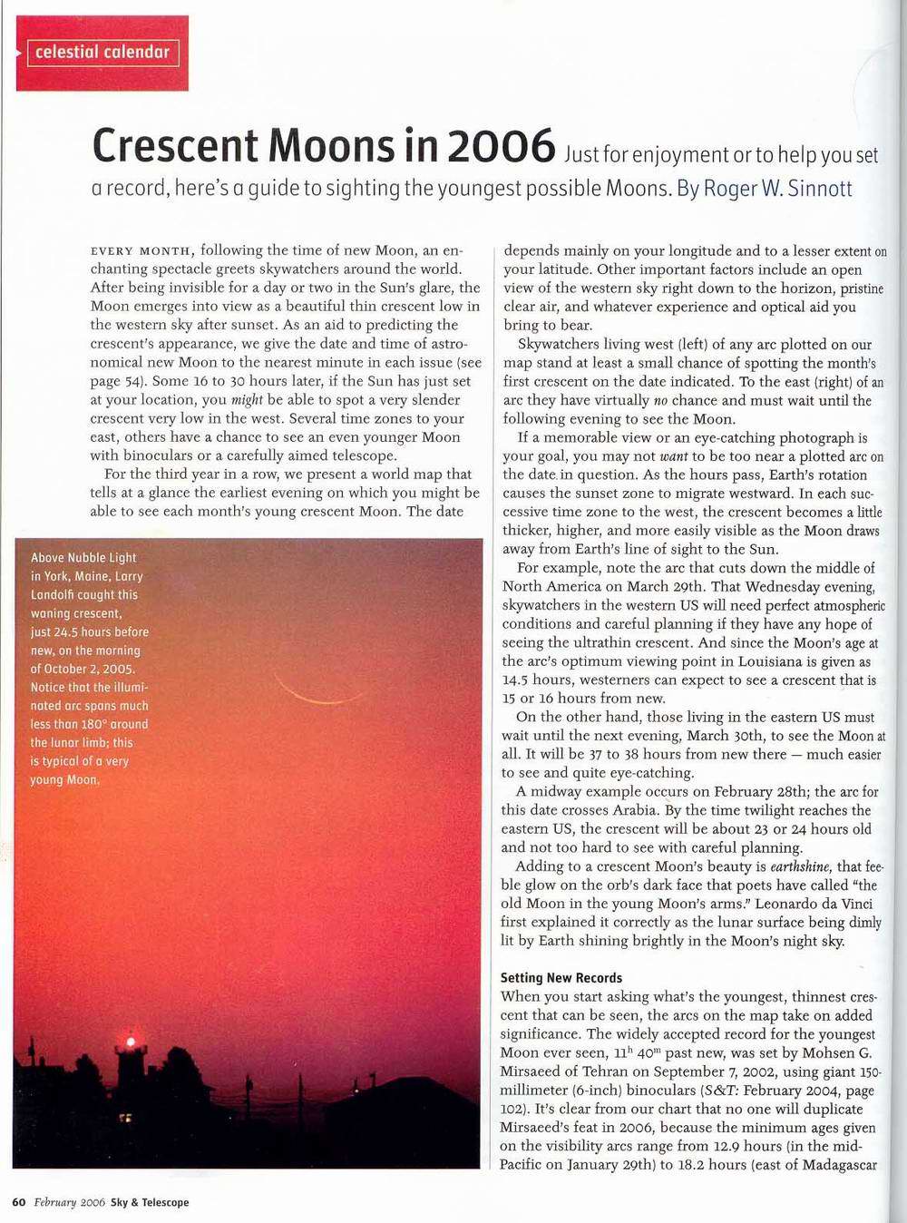 همانطور که قبلا به اطلاع اعضاء محترم گروه و علاقه مندان به رویت هلال ماه رساندم ، آقای سینات در نامه ای به اینجانب قول دادند که در شماره ماه فوریه 2006 مقاله ای در مورد رویت هلال ماه به چاپ برسانند، ایشان مثل همیشه به قول خود عمل کرده و مقاله ای را در مورد رکورد جوان ترین هلال ماه و اینکه چه هلال هایی در سال 2006 در جهان دارای اهمیت رصدی است و همچنین تحلیلی در مورد حدّ دانژون ، تحلیلی از رصد آقای استم ( هلال صبحگاهی اکتبر 2004 ) ، دو رصد کمترین جدایی زاویه ای رویت شده در جهان ( رصد اینجانب درتاریخ 7 سپتامبر 2002 و رصد آقایان موحد نژاد و گیاهی یزدی در تاریخ 19 اگوست 2001 ) و. .. رادرمجله Sky & Telescope به چاپ رساندند .